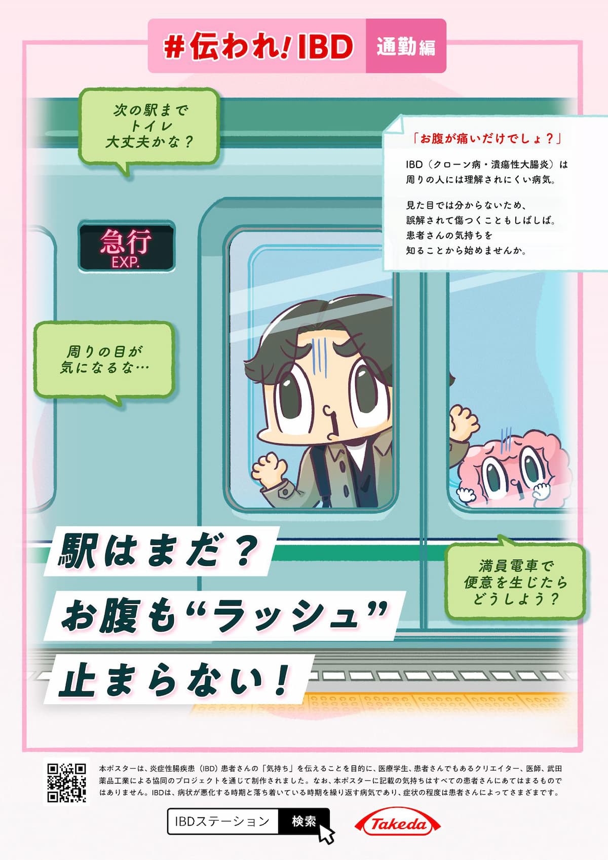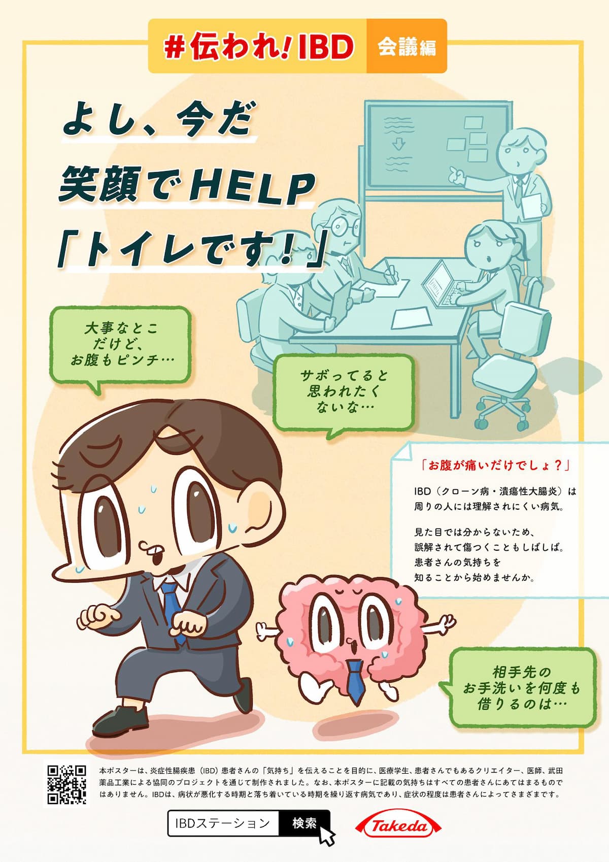ポスターは、「通勤」「会議」「食事」「働き方」の4つのテーマでIBD患者さんの気持ちや困りごとを表現しています。