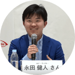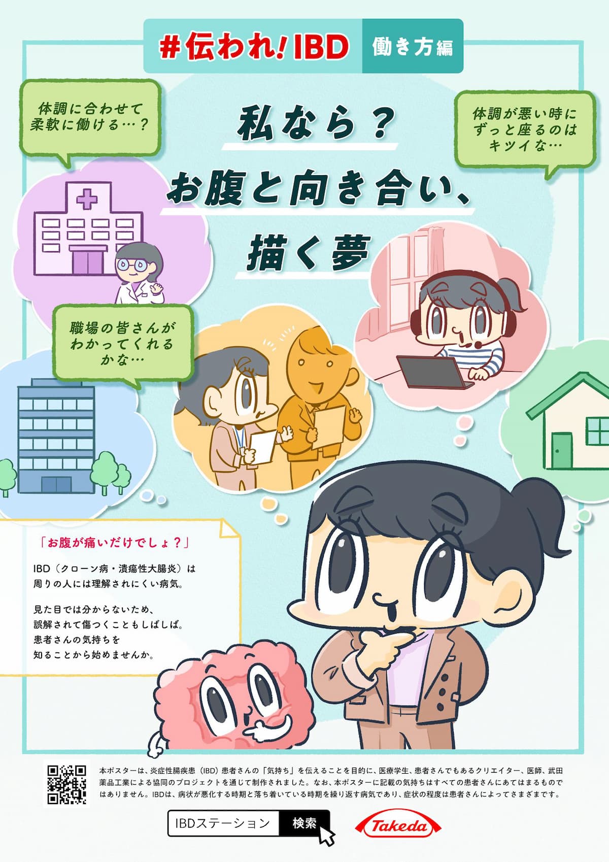 学生は、IBD体験プログラム「In Their Shoes」を経験しながら、石井洋介先生の講義やトークセッションを通じて、働くIBD患者さんの生の声に触れ、コピーライターの永田健人さんの指導のもと、患者さんの気持ちを表現するキャッチコピーを考案しました。なお、ポスターのイラストは、イラストレーターのカメダさんが制作しました。
